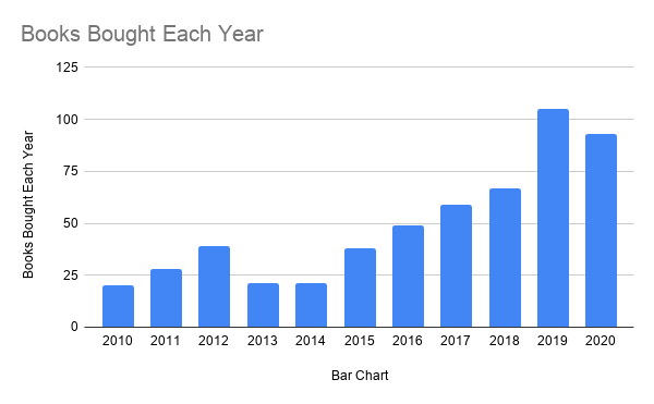 I am flabbergasted that the number of books I bought went down, considering how many I bought at the beginning of the pandemic for stimulus reasons and online author visits: