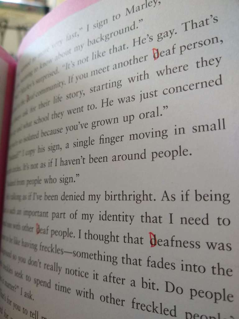 Piper is a deaf girl with hearing aids in a private high school with hearing students. Her best friend, Taylor, often serves as a hearing guide of sorts, which resonated with me. I often ask my spouse what another person said, be it the cashier, the neighbor, or our nieces and nephew. However, while my reliance often occurs when I am not wearing my hearing aids because I didn’t feel like it, Piper is relying on very little hearing and years of speech therapy because to her, deafness is a medical issue.