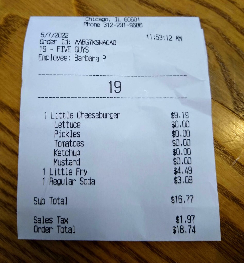 I took a lunch break. While Chicago is the land of inflation, there is now inflation-inflation, and thus you pay $18.74 for a small burger meal.