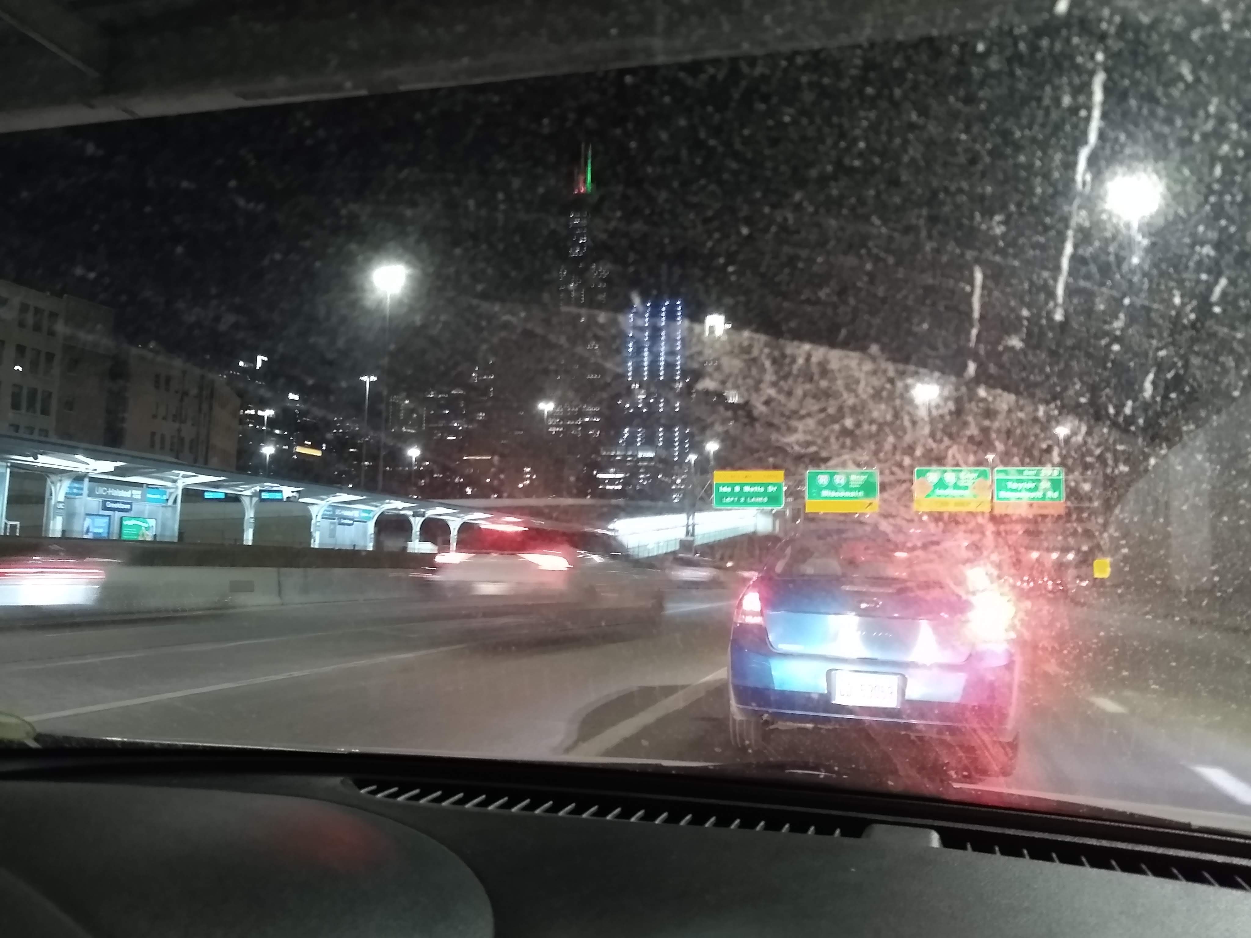 Never mind Nick’s dirty windshield, this is the Chicago skyline as we sit in backed-up traffic. There are always slow downs thanks to frequent car accidents.