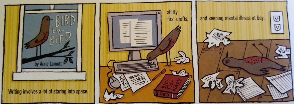 In Brown’s book, she literally uses three panels (which is how old-school comic strips were printed) to summarize the salient points of classic literature. Of course, she hits the points that make her comic the funniest. My favorite, because I’ve read the book a few times and even used it as a text when I taught fiction one semester, was Bird by Bird by Anne Lamott.