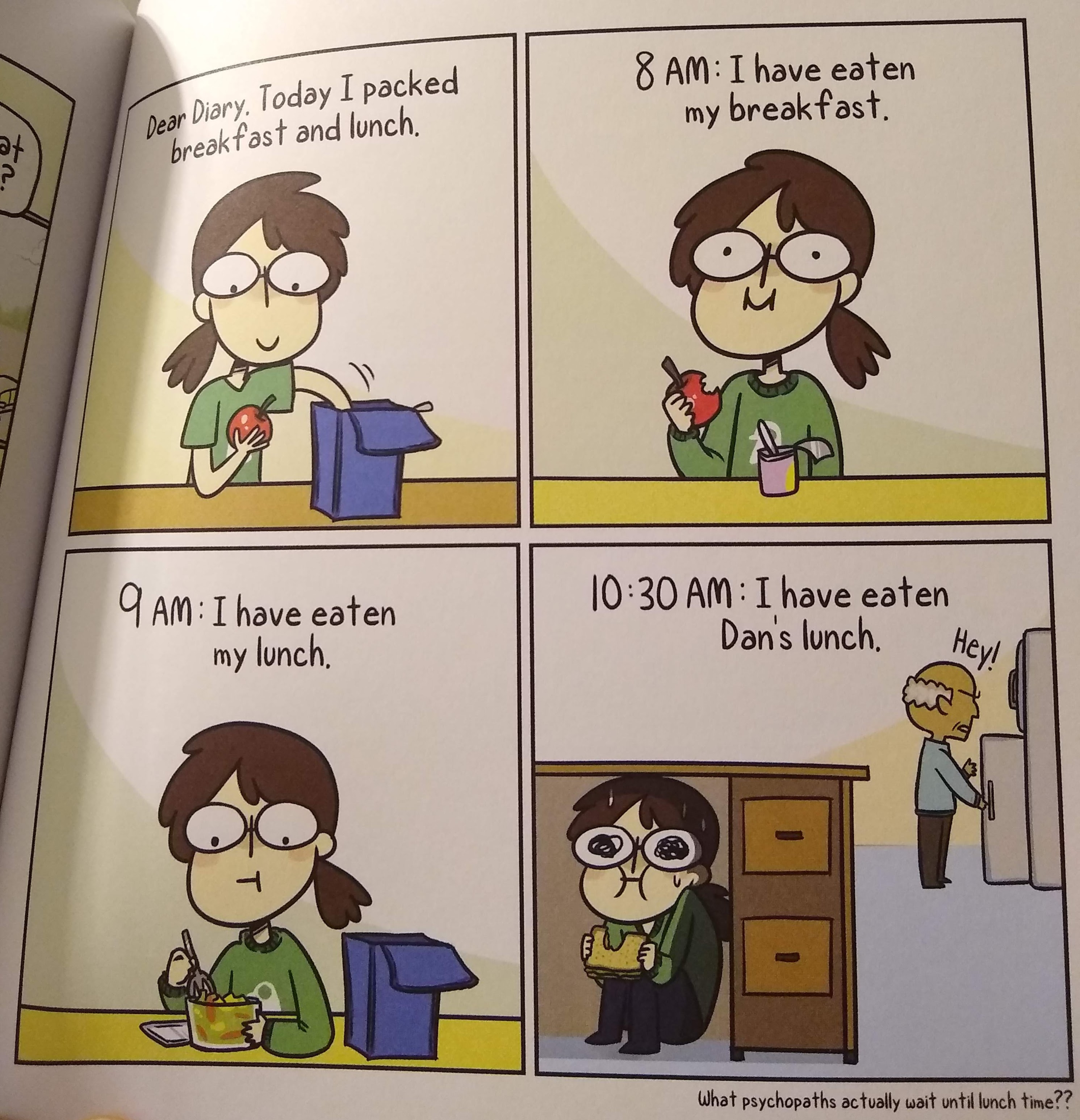 I find humor in this one because I think we’ve all had one of those extra hungry days during which you eat your lunch unrealistically early and then panic the rest of the day because you have no food. Stealing Dan’s lunch just seems like the next logical step at this point! Part of why this comic made me laugh is because in a comic earlier in the book, Zei describes how she’s eating a healthy breakfast and doing a potion controlled lunch, then a healthy dinner — only to find herself after midnight scarffing pizza because all of her “health” food provided little sustenance.
