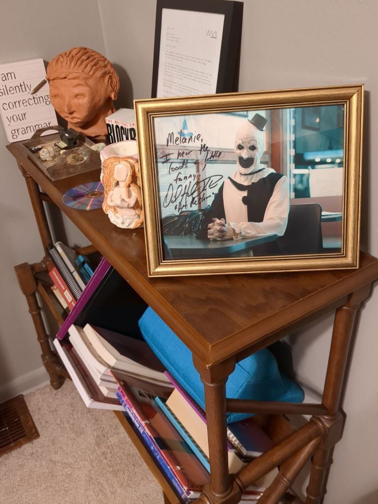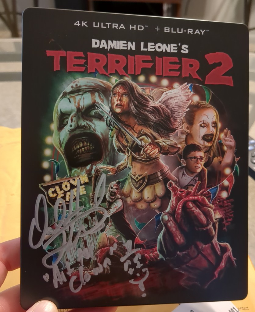 - The very next day, there was more mail. I was a little concerned, because Meg, also from Huntsville, sent me a text with a photo of what she was sending me. It looked like a picture that Art the Clown had autographed. Well, Meg, it turns out, is CHAOTIC GOOD, which means she’s a liar for happy reasons. I opened my mail and found what I can only describe as a whole-ass Blue-Ray of Terrifier 2, and that was what she had autographed.