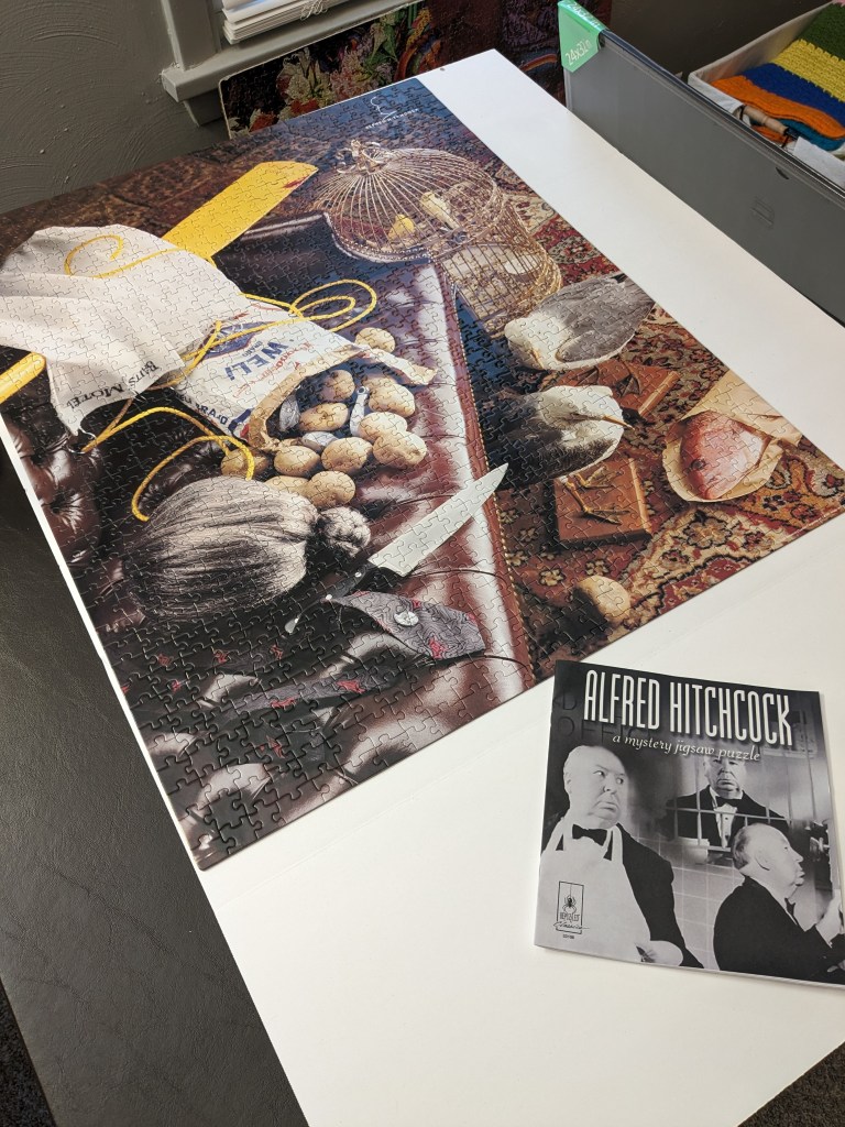 - Alfred Hitchcock mystery puzzle finished! I will say, finishing the puzzle in no way helped us solve the mystery in the booklet.